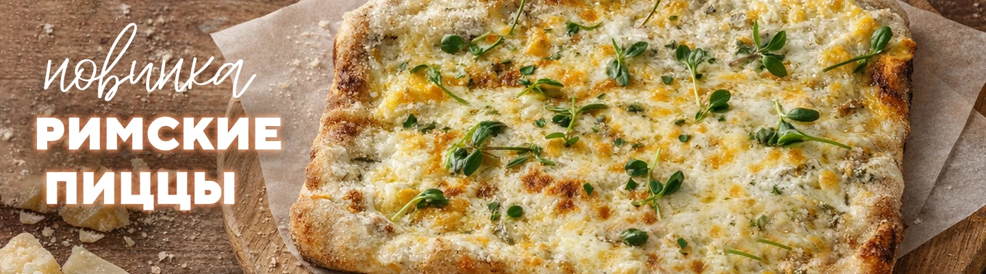 тесто для пиццы, сыр «Моцарелла», ветчина, шампиньоны жареные, помидоры свежие, сметанный соус с ароматом грибов, зелень свежая